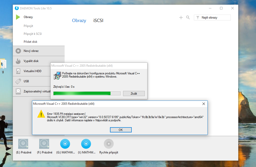 z určitých důvodů jsem byl nucen přeinstalovat Win10 a po reinstalaci mi začalo blbnout otevírání virutálních jednotek v Daemon Tools. Háže to nějakou hlášku ohledně microsoft visual 2005 c++. díval jsem se do systému a já mám nainstalovaný 2010. nemohlo by to být tím? přikládám printscreen pro lepší porozumění problému. Za všechny rady předem děkuji!