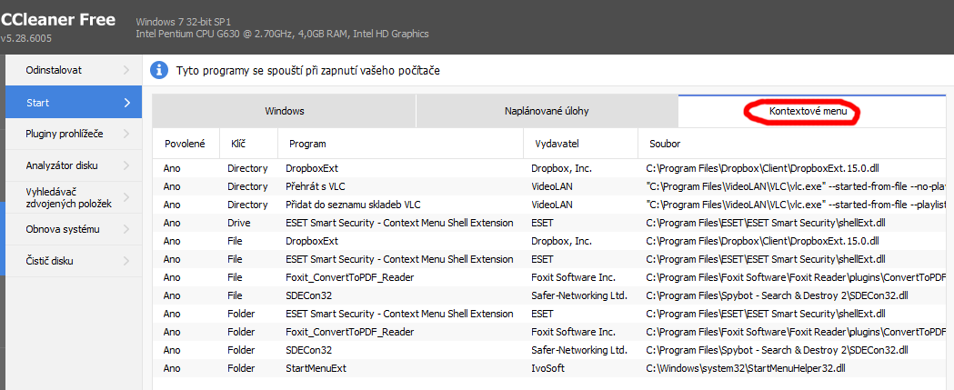 CCleaner ukazuje spouštěné programy při startu v oddíle "Kontextové menu" viz obr. Nemůžu však najít ve Win7, kde to ty Win při startu spouští, abych to mohl zakázat. Poradí někdo kde to je?