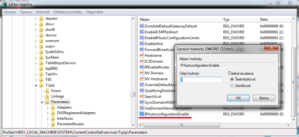 Tuto hodnotu pojmenujte "IPAutoconfigurationEnable"