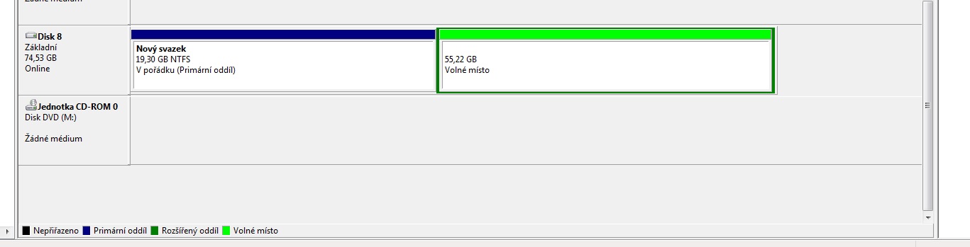 Disk byl dříve zřejmě rozdělený na dva oddíly a na jednom z nich byl nejspíš ještě systém. Oba dva oddíly jsem zformátoval a pak jsem otevřel správce disků, kde byl rozdělený na tři části 15GB(primární oddíl), pak 3GB nepřiřazeno ( to jsem připojil k tomu prvnímu) a druhý svazek, který jsem odstranil.