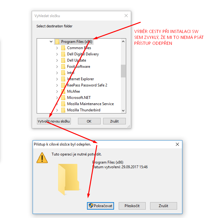 Standardni uzivatel (ne admin) nema mit prava zapisu do systemovych slozek.