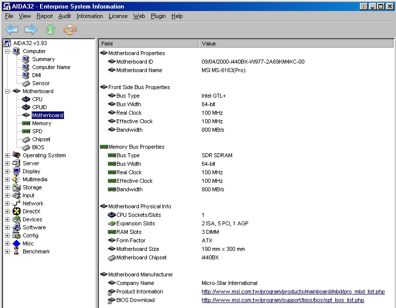 Jeden z nejzdařilejších chipsetů od Intelu - i440BX. V té době bylo MSI jeden z nejspolehlivějších výrobců základních desek.