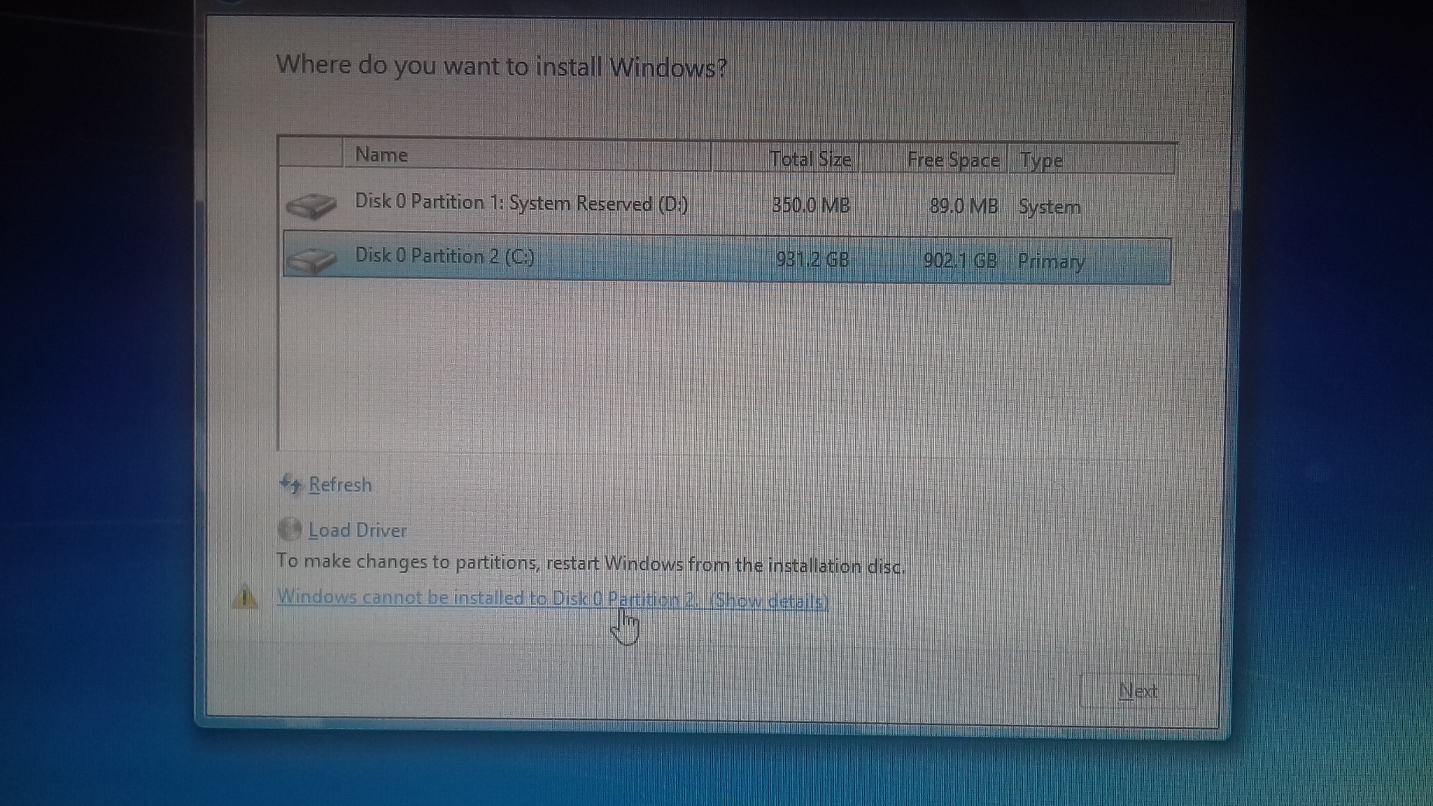 Odstráň si obe partície disku a vytvor novú.Stačí jednu na C a nemusí to byť celá kapacita disku.Stačí aj 200GB.Zvyšok zatiaľ nechaj tak.
