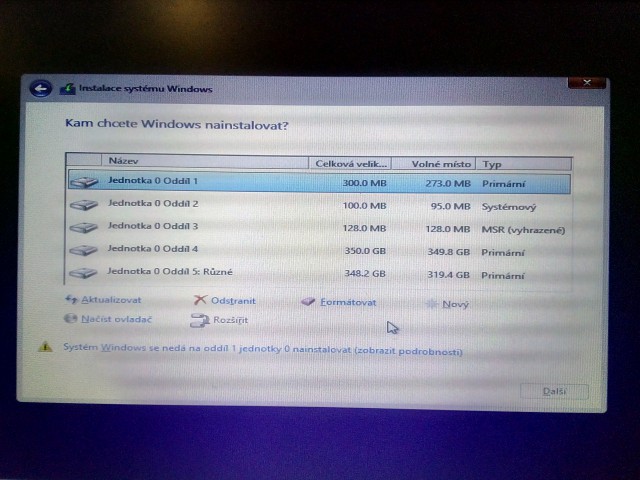 Na oddíl 1 určitě system nainstalovat nepůjde. Jde to na oddíl 4 ? Ten je prázdný (bez dat)
