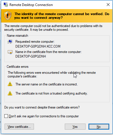 Uvedeným dialogem tě tvůj počítač informuje o zabezpečeném spojení, ke kterému nemá schválený certifikát. Pokud je to na základě tvé operace (pokus o připojení přes RDP), je to v pořádku a můžeš připojení schválit. Pokud zatrhneš "Dont ask..." pak už se příště ptát nebude.