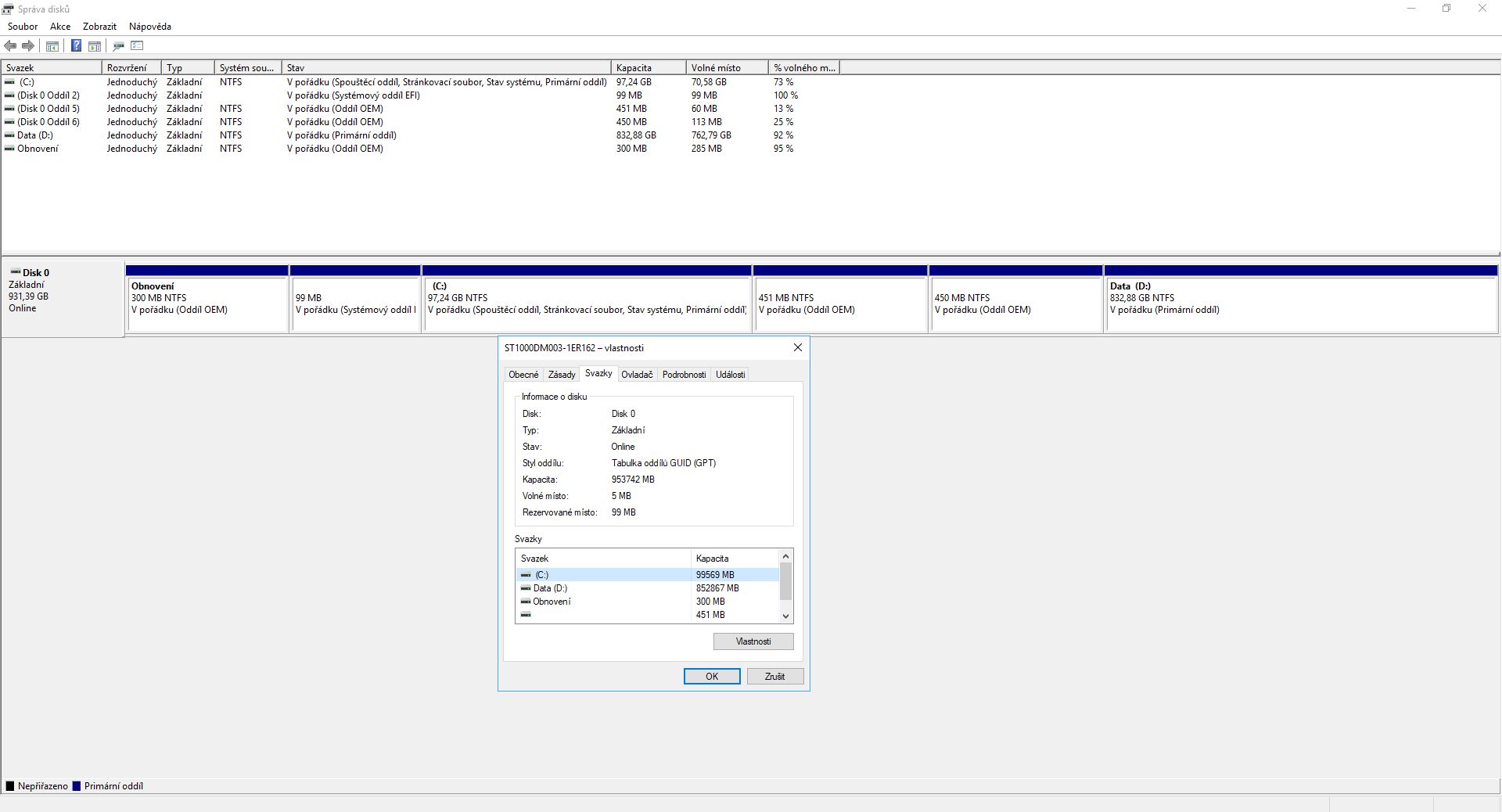 Když jsem ve správě disků kliknul na šedě označený Disk 0 a dal vlastnosti, je u "Styl oddílu" napsáno "Tabulka oddílu GUID(GPT)"