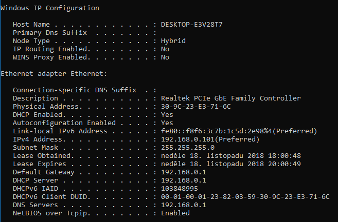 Bude mě zajímat výpis ipconfig /all při provozu a při výpadku.