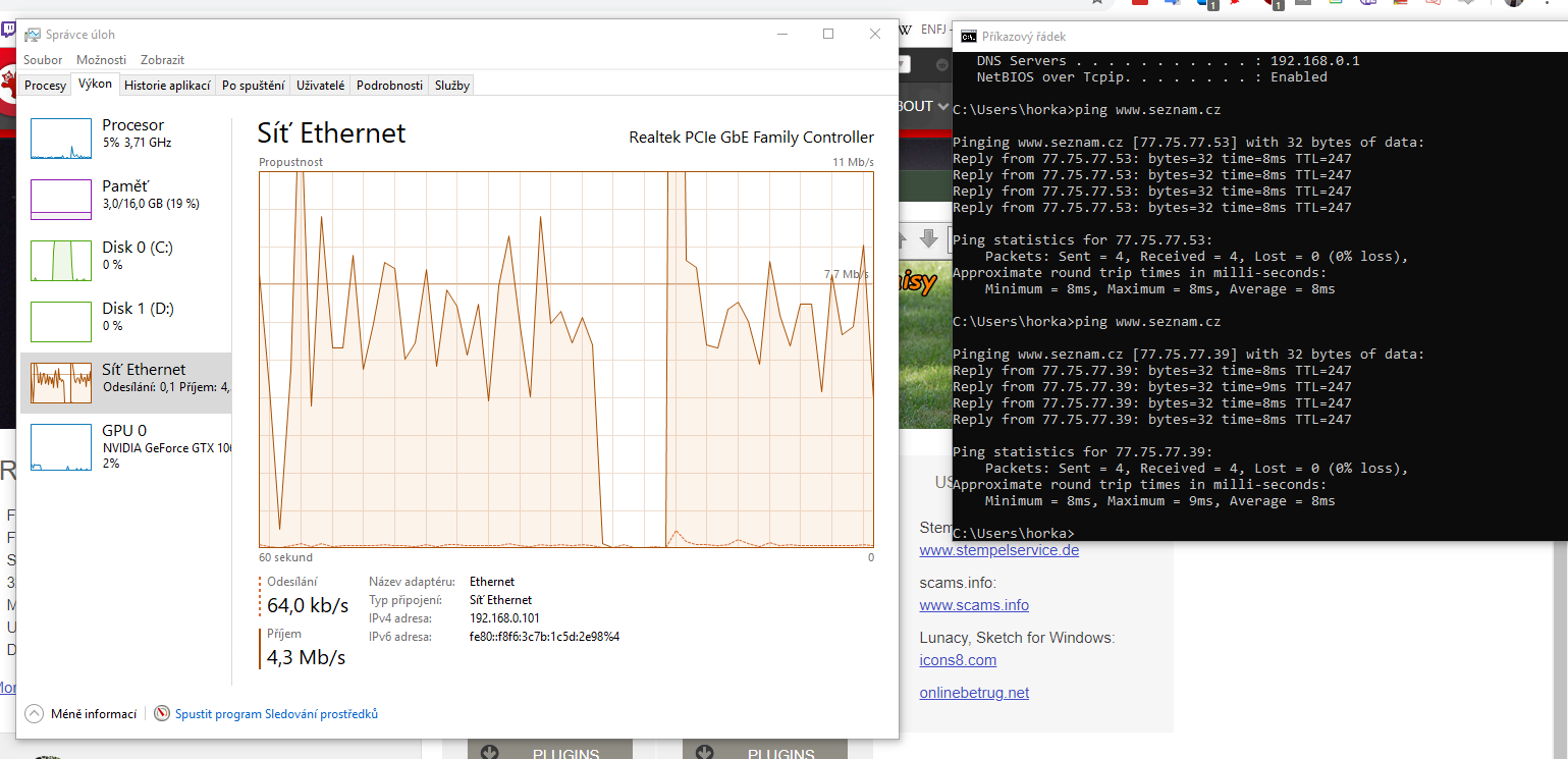 Ping mi nic nezaregistroval, přidávám ještě screenshot ze správce úloh, kde je to vidět. Ani mi nepřišlo, že by se ten příkaz nějak zastavil, ale všechny stránky stejně přestaly na pár vteřin fungovat. Těch pár vteřin prostě není příjem ani odesílání dat.
