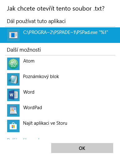 Po instalaci PSPadu se udělal sám výchozím, změnit na textový editor ani mnou preferovaný Atom to nejde. Jediná aplikace která se mi podařila nyní nastavit jako výchozí je WordPad. Ovšem ne a ne tam dostat jako výchozí aplikaci klasický texťák nebo Atom.