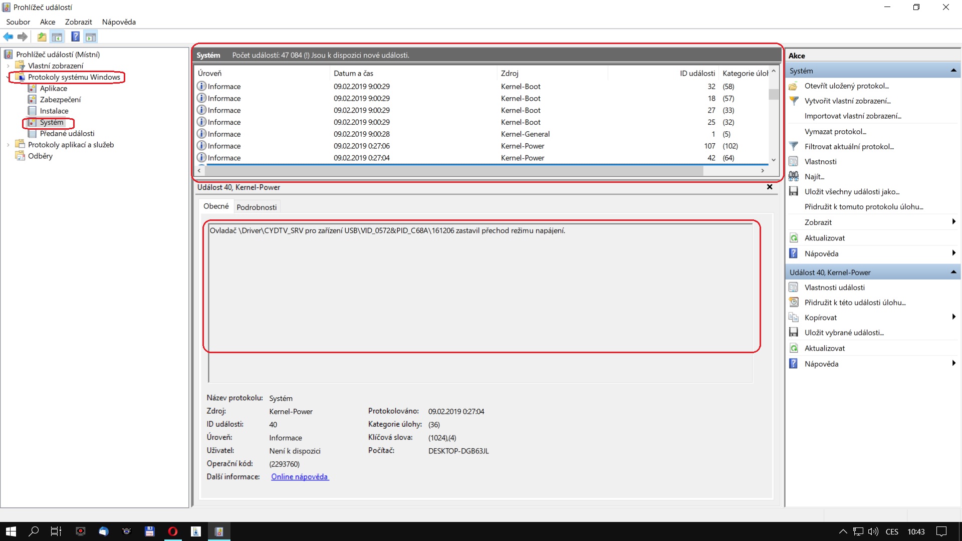 V prohlížeči událostí otevři Sytém Windows a tam Systém. V pravém horním okně vyber postupně události, které se časem shodují s časem nechtěného zapnutí a v dolním okně je pak jejich popis, kde by mělo být napsané, čím bylo probuzení vyvolané.