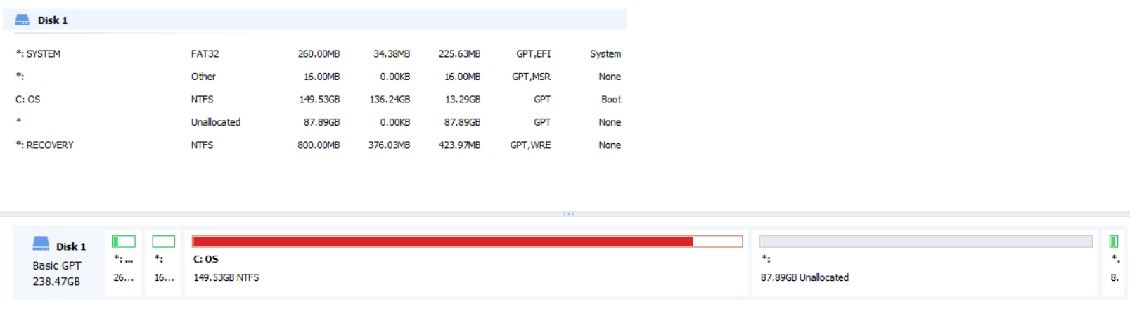 rád bych tu požádal o pomoc. Mám na notebooku dualboot Win10 + Ubuntu a jelikož mělo Ubuntu až moc místa, zmenšil jsem jeho Home partitionu s úmyslem zvětšit o stejnou velikost mojí C partitionu pro Windows. Vytvořil jsem 30GB nealokovaného volného místa, které ale není hned vedle C partitiony a ta tedy nelze jednoduše expandovat (ani výchozím windows nástrojem, ani pomocí EaseUS nebo PartitionWizarda).