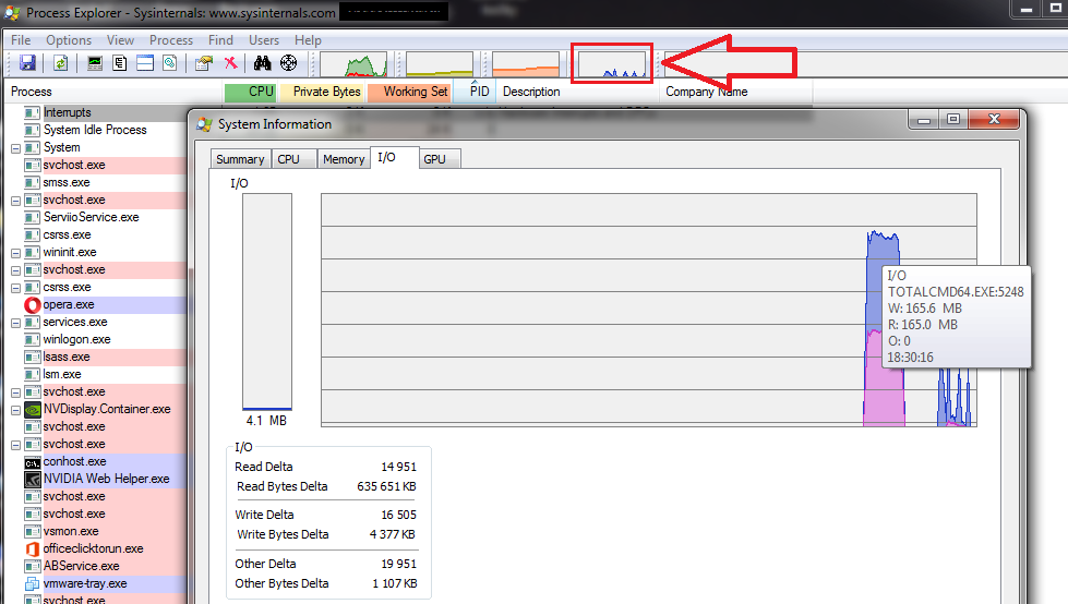 Process explorer i to I/O okno minimalizuj. A pracuj. Až přijde lag, překlikni na I/O okno a najeď myší na to vytížení. Zobrazí se ti proces, který vytěžuje disk. V mém případě jsem spustil kopírování souboru přes totalcommander.