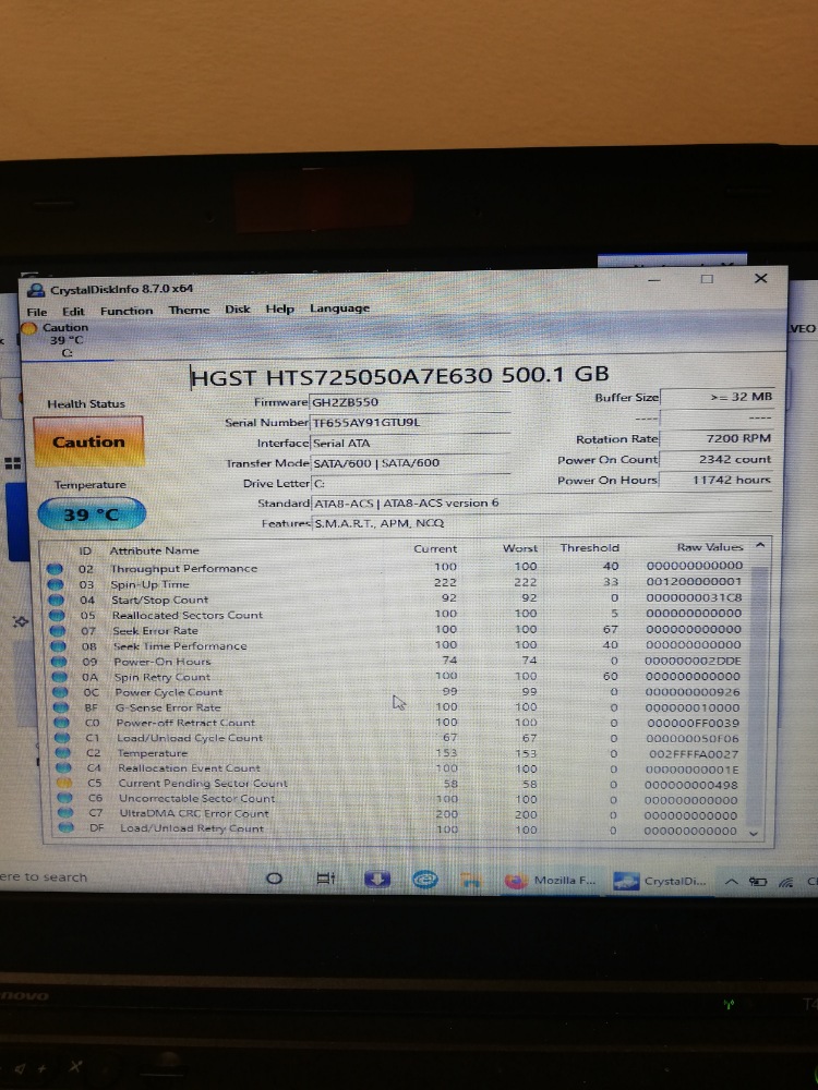 Nakonec se mi podařilo do počítače dostat a spustit Crystal disk info. Nemůžu se z počítače dostat na tenhle web, protože počítač během zadávání adresy několikrát zamrzne, což znamená, že sem nedám ani log ani screenshot, proto posílám alespoň vyfocený monitor.