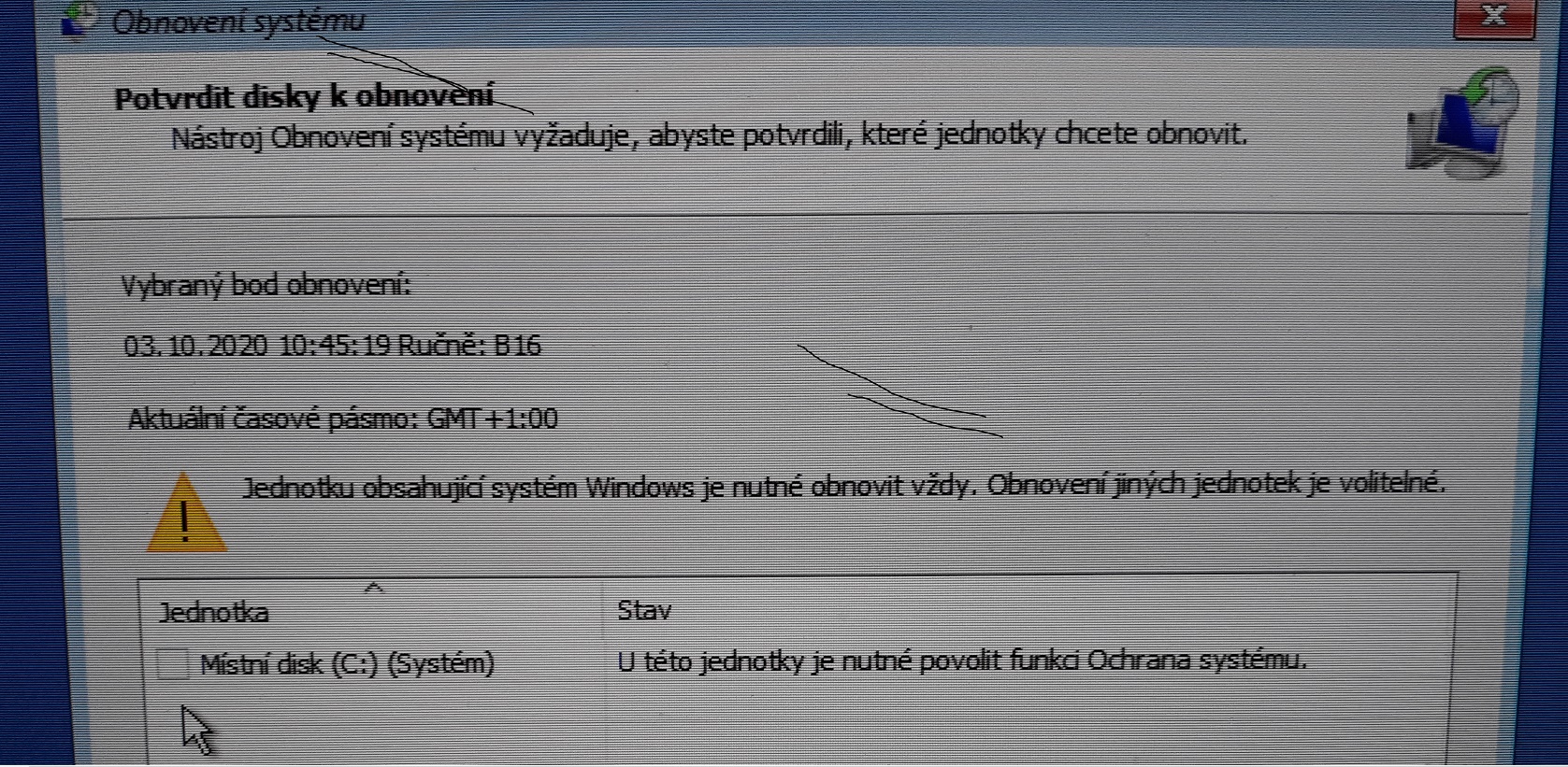 Poznámka: K nástroji pro obnovení systému se dostanu, ale disk C nejde zaškrtnout a nepustí mě to dál.