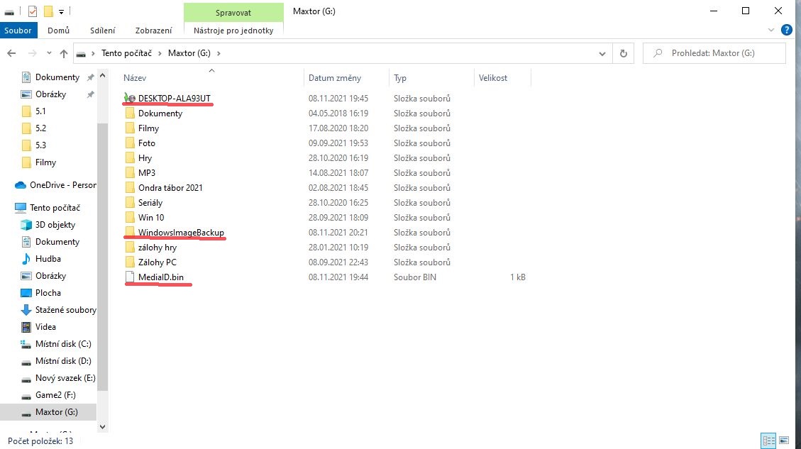 Ahoj. Udělal jsem kompletní zálohu systému na externí disk pomocí nástroje ve WIN10 /Tj. data + bitová kopie/.Zapomněl udělat složku, ale to jen na vysvětlení proč je to tak rozhozené. Na disku se mi vytvořily tři nové soubory. Na obr. podtržené. Z nichž první dva mě ukazují Prázdnou složku a poslední má kolem 500bajtů. Proč to tak je , když na disku je uložena záloha s bitovou kopií celkem o velikosti kolem 120GB ? Mám to tak vždy, ale nějak jsem to neřešil , až teď mi to začalo vrtat v hlavě.