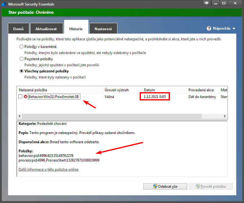 Po hodině MS vydal opravenou verzi virové databáze, ale bohužel mi v karanténě zůstal výše zmíněný Emotet.