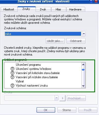 Start --> Ovládací panely --> Zvuky a zvuková zařízení --> záložka Zvuky ( viz obrázek )