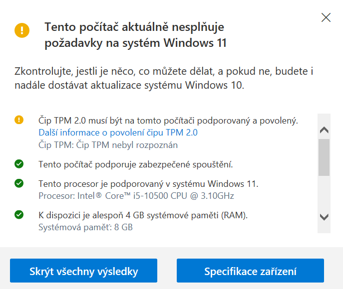 a chtěl bych do něj Windows 11, po kontrole kompatibility na mě vyskočila tato hláška.