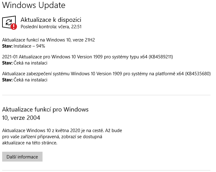 ad 5) a 6) je potřeba nejdříve vyčistit pozůstatky po nepovedených aktualizacích. Jak na to třeba zde: viewtopic.php?f=46&t=220550&p=1726557#p1726557