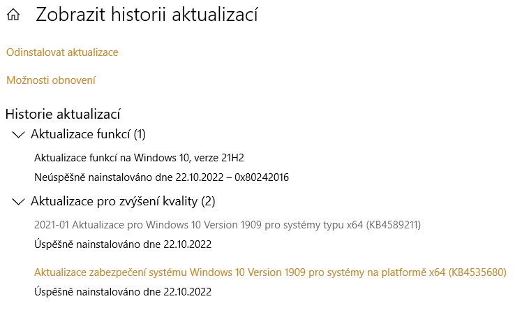 5) Automaticky to ale stáhne "Aktualizace funkcí na Windows 10, verze 21H2", ale na konci instalace to skončí chybou 0x80242016 a napíše to "Aktualizace se nám nepodařilo dokončit. Vracení změn zpět."