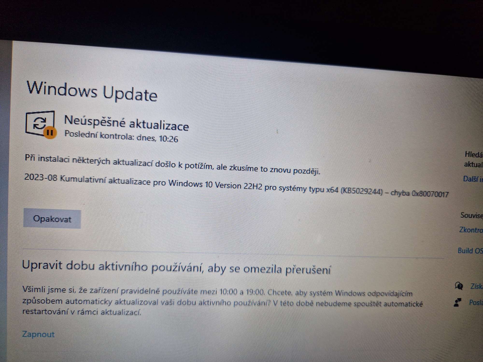 Tentokrát se problém objevil zase, až na to, že počítač je absolutně nepoužitelný, odezva na pokyny je tak 20 sekund. Opět jsem ve Windows updatu odhalila, že se mi tam cpe nějaká aktualizace, ovšem problém je, že ukazuje, že se stáhne, následně se instaluje z 0 na 20%, potom na 73% a na 100%. Jenže poté už jen následuje hláška, že došlo k potížím. Přikládám obrázek o jakou aktualizaci jde a jakou chybu to hlásí. Už jsem to zkoušela x krát a vždy to takhle skončí.