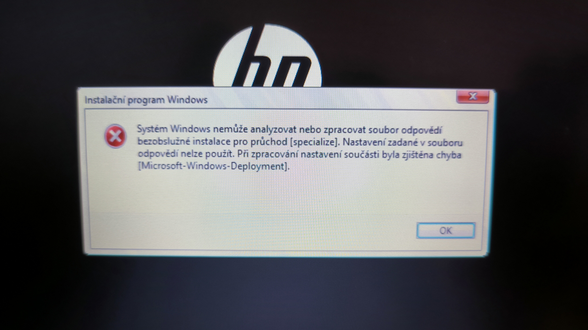 Systém Windows nemůže analyzovat nebo zpracovat soubor odpovědí bezobslužné instalace pro průchod [specialize]. Nastavení zadané v souboru odpovědí nelze použít. Byla zjištěna chyba při zpracování nastavení součásti [Microsoft-Windows-Deployment]