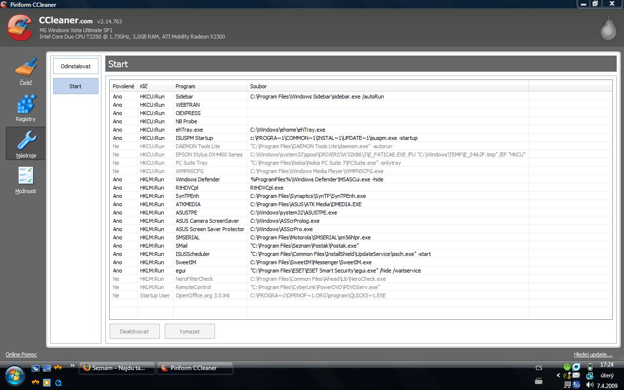 K programům-to musíš zjistit sám co chceš aby se spouštělo při startu.Samozřejmě spuštěný antivir-defender a bezpečnostní programy.Zbytečnosti jako Nero-Cyberlink atd. v klidu smazat.Třeba takový Daemon jestli máš nastavený při startu Win tak nechat atd.Pokud nevíš co znamenají zkratky pod kolonkou programy tak zadej ten název do http://www.google.cz/ a ten snad řekne co k jakému softu patří.