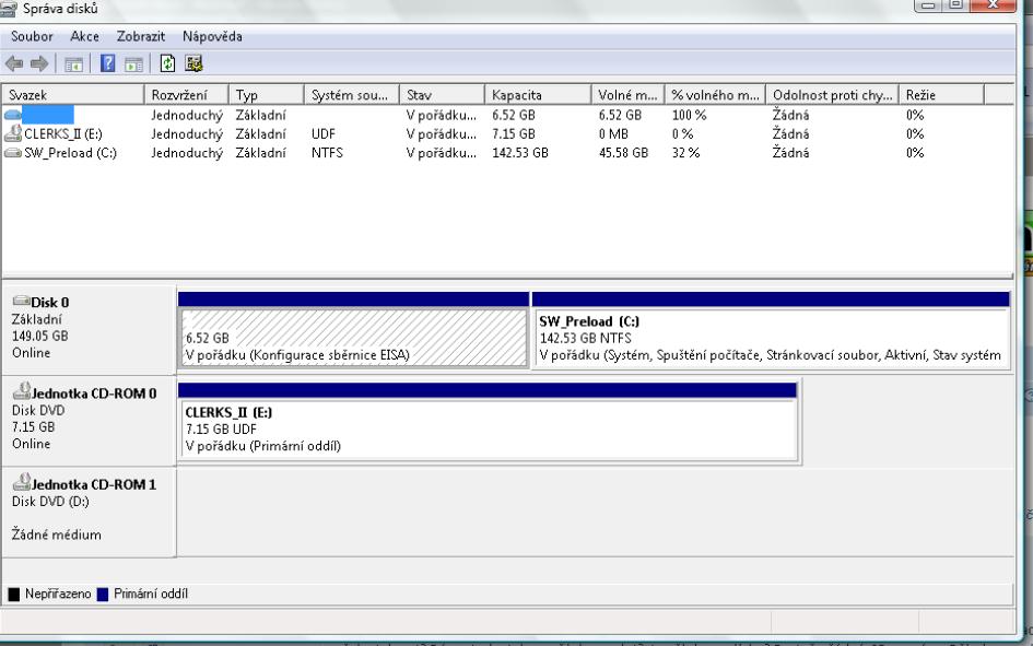 jo, jsou tam tři ikonky disku......u jednoho neni žádnej nápis, druhej je DVD mechanika a třetí má název disku C.....akorát u toho prvního je že má kapacitu 6.52GB, ale že je tam 100% volnýho místa, teda těch 6.52GB