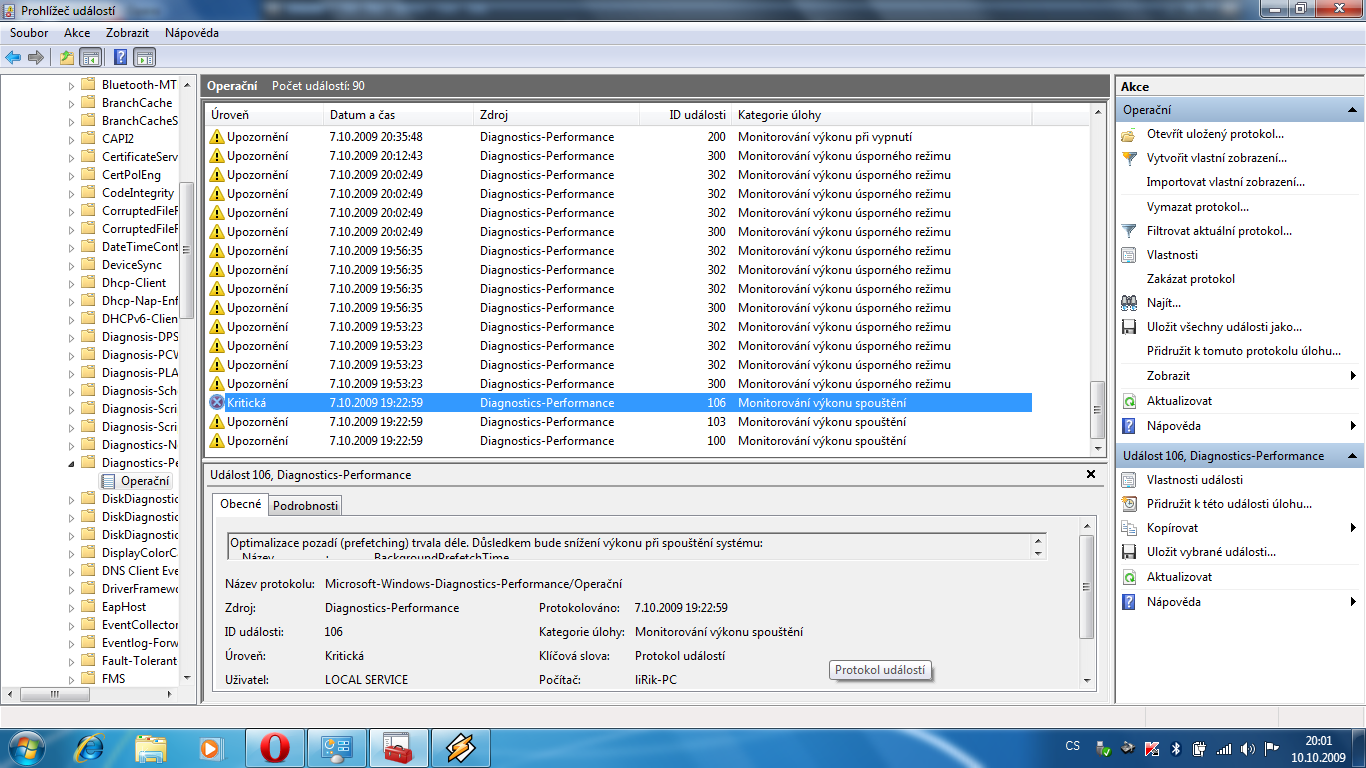 Podíval jsem se do prohlížeče událostí a všiml jsem si kupy upozornění, několik chyb a dokonce i jedný kritický, ale moc tomu nerozumím. Netuší někdo jak to vyřešit?To check if a particular program is slowing the machine when you switch on or shut down, e.g. an antivirus program, go to Control Panel > All Control Panel Items > Performance Information and Tools > Advanced Tools (in the left pane). On this screen the problem is sometimes shown. If not, click View Performance Details in Event Log (Event Viewer). Events in the 100 series are boot events and I believe those in the 200 series are shut down events. These can be followed up by double-clicking them, then clicking Event Log Online at the bottom.