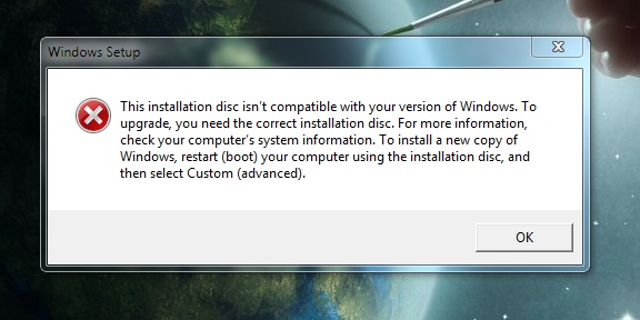 a skoušel jsi windows instalovat nabootováním z DVDčka ??? tuto chybu ti to totiž píše, když skoušíš nainstalovat / upgradovat například windows vista 32bit na windows 7 64bit .... to NEJDE...musíš nabootovat s DVDčkem..pak už to půjde