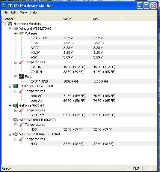 Procesor mi myslím taktoval bobík, co mi PC skládal. V zátěži to nebylo. Jela pouze Mozila s otevřenýma dvěma panelama, email a farmerama.comsamotarrk píše:Jaký máš PC? Hlavně zdroj uveď. A taktoval si CPU a nebo GPU i kdyby jen na zkoušku? Bylo to v zátěži a nebo v klidu? Bylo by dobré ukázat teploty, které zjistíš tímto programem: http://www.slunecnice.cz/sw/hwmonitor/" onclick="window.open(this.href);return false;