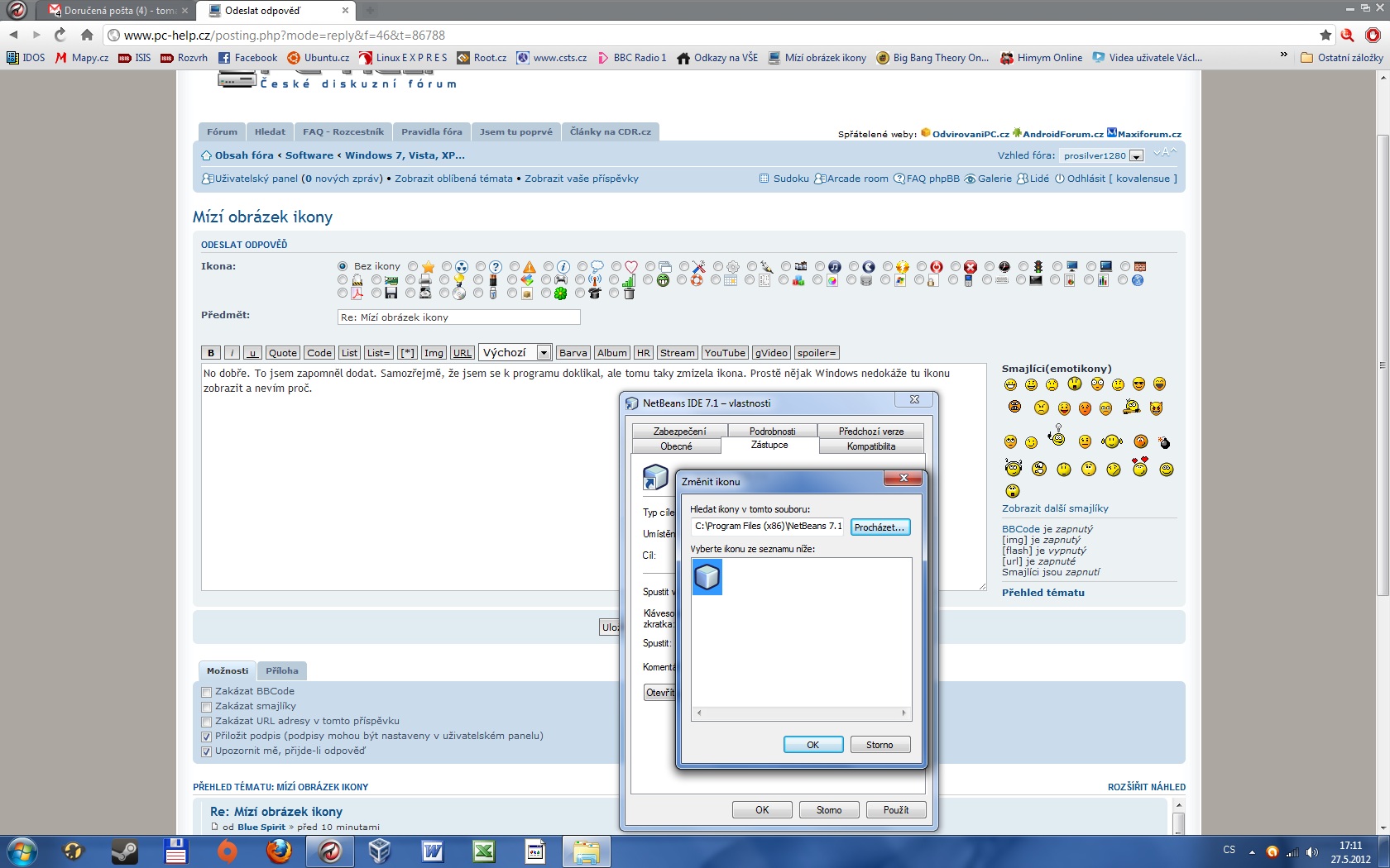 EDIT: tak už to zase OK není. Zase tam skočila ta nesmyslnost. Je to zvláštní na ploše jsme měl zástupce asi rok a v pohodě a když to připnu na lištu tak to takhle zlobí. Posílám i obrázek, který ukazuje co na mě vyskočilo při pokusu měnit ikonu.