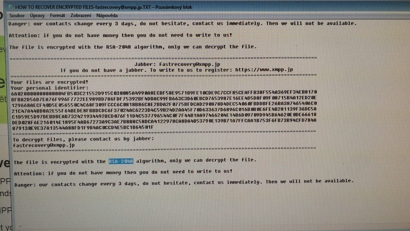 Dej vědět , budeš muset poslat 3-4 zašifrované soubory pak. Píšou tam , že ta e-mailová adresa pro komunikaci s vyděrači se mění co 3 dny , ale nečetl jsem to celé.