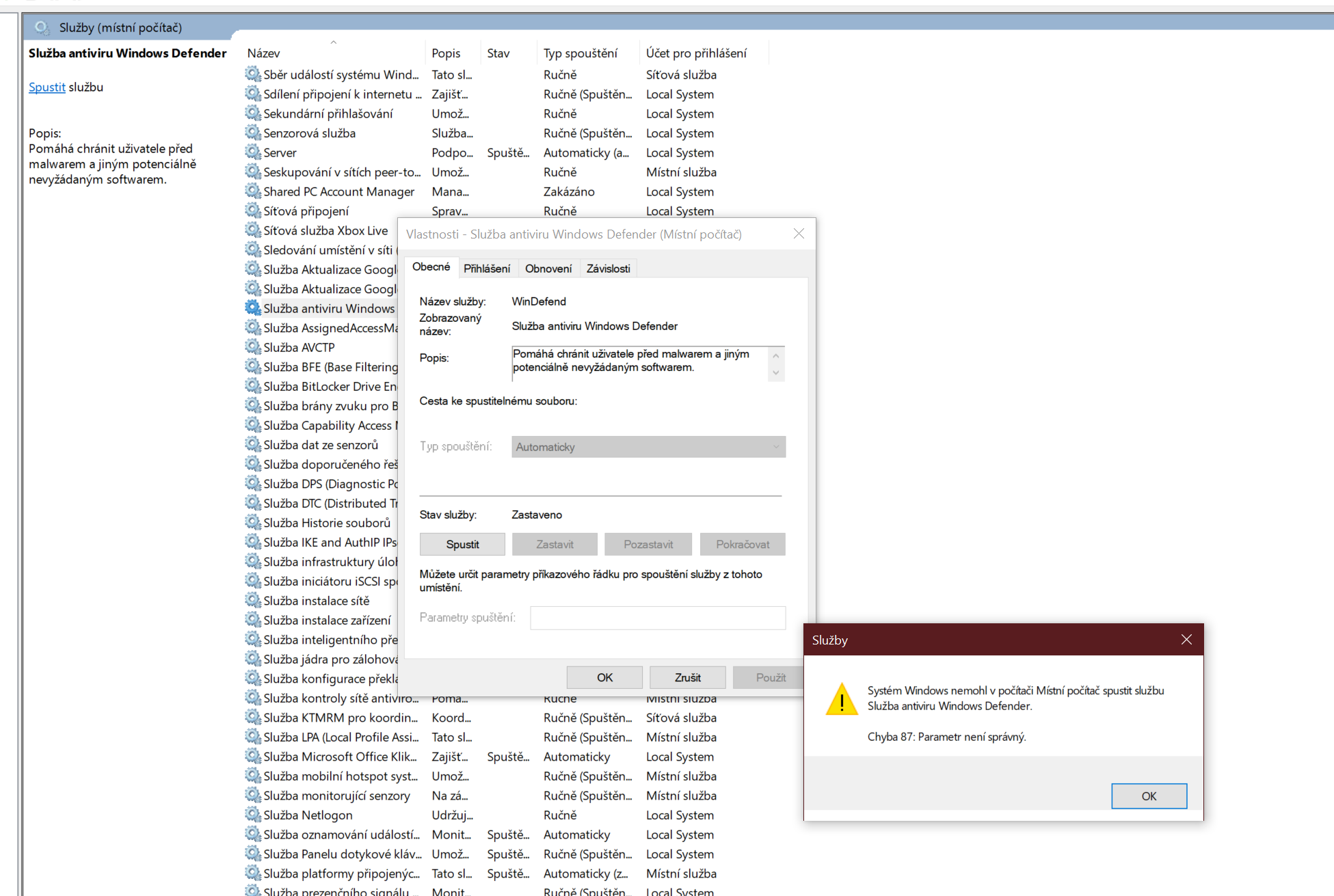 nejspise se mi povedlo dostat do PC nejaky bordel. Nejde mi spustit windows deffender a ani nemuzu aktulizovat windows. Ve sluzbach jsem zkousel manualne spustit Windows Deffender, ale nejde (viz. obrazek). Zkusil jsem milion navodu na youtube, kde mam vymazat par veci v registrech a dale nastavit neco v gpedit.msc, ale taky bez uspechu. Predtim mi nesla zapnout real-time ochrana. nyni mam jen uplne prazdne okno, kdyz jdu do nastaveni Windows deffender (viz. obrazek 2). Jsem z toho pomerne nervozni. Dale jsem spustil Malwarebytes antivir sken a neco nasel a vymazal. Ale jsem stale kde jsem...