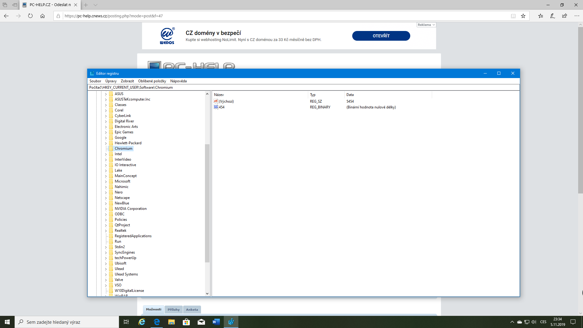 Ať jsem dělal co jsem dělal, všechno bodle návodů na internetu nepomohlo. Program Chromium jsem odinstaloval.V Regeditu jsem ručně odstranil Chromium včetně všech jeho podklíčů. Restartoval jsem PC , kouknu do Regeditu a nic tam nezůstalo ani po důkladné 2 hodinové kontrole. Vypnu večer pc a ráno ho zapnu, kouknu do Regeditu a znovu tam je Chromium. Výkon pc to vůbec neovlivní, jen to prý údajně posílá informace o platebních kartách útočníkovi. Ale proč to tam pořád je? Jak se může vymazaný klíč z registru znovu sám obnovit? Antivirus mi Chromium nikdy nedetekoval a nikdy to neovlivnilo žádnou aplikaci. Přišel jsem na to, až když jsem mazal pozůstatky Avastu, které CCleaner také nesmazal a já se už několik let v registrech hrabu a koukám, jak to tam vypadá po instalaci nových windows a po instalaci nových programů, takže už to prostředí znám hodně dobře a divné klíče si prověřuji u Microsoftu, jestli nejde o Malware, Bloatware nebo Virus trojan apod. a jestli je mohu smazat.