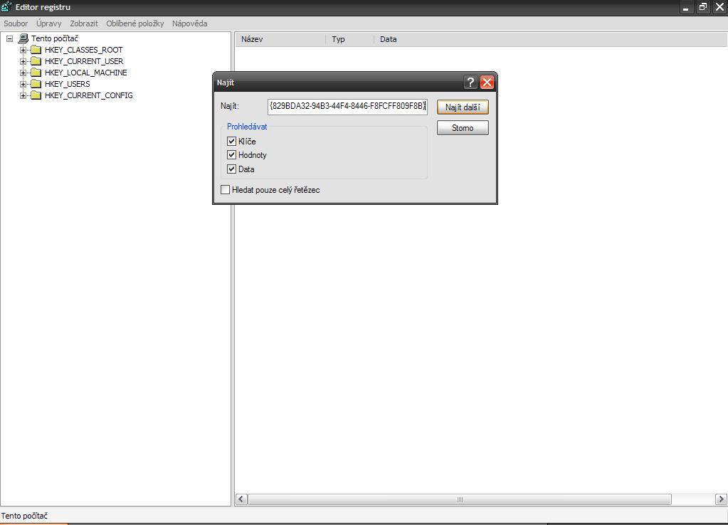 Start-->Spustit a napiš regedit, otevře se ti Editor Registru. Dáš Úpravy-->Najít a vlož: {829BDA32-94B3-44F4-8446-F8FCFF809F8B}.