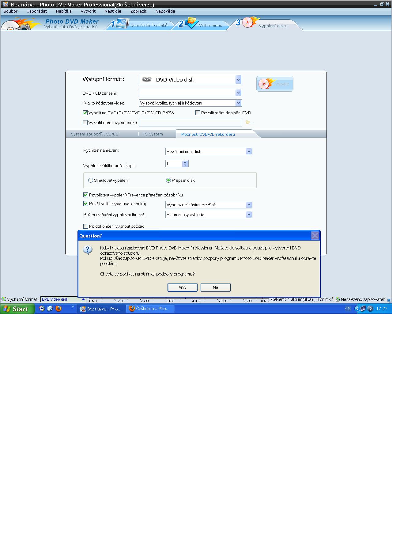 Tak jsem zkusila znovu odinstalovat a naistalovat program a pořád mi to píše že to nemůže nalézt vypalovačku, kterou samozřejmě v PC mám.