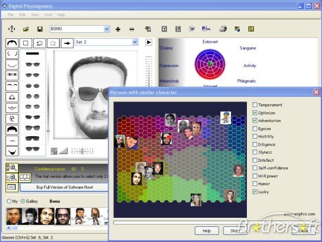 Digitální fyziognomie je zábavné psychologické profilování softwarová aplikace, která se vztahuje tvář analýzy odhadnout lidské vlastnosti a určit typ osobnosti. Nástroj funguje jako policejní nákres, takže uživatel musí zvolit různé části obličej osoby. Mezi vlastnosti vyhodnocuje jsou intelekt, optimismus - pesimismus, konformismus - dobrodružnosti, egoismus - altruismus, lenost, poctivost, dokonce i štěstí. Aplikace přichází se souborem více než 1000 vzorků lidské tváře čtení.