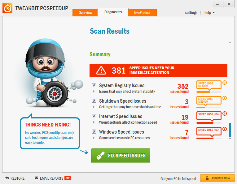 PCSpeedUp runs a comprehensive checkup on your system and detects every issue that may be slowing it down. We have developed powerful scanners that zero in on registry errors, fragmentation, incorrect system or Internet settings and other speed thieves for a precise verdict.