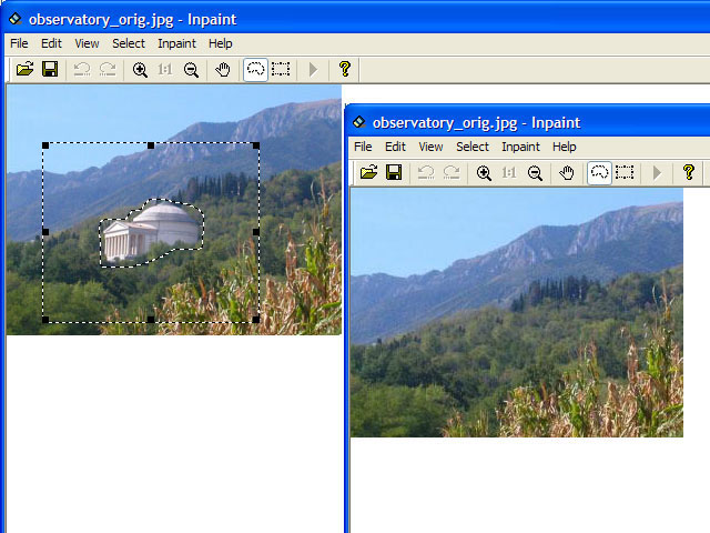 Inpaint rekonstruuje vybranou oblast obrázku z pixelů v blízkosti místa hranice. Inpaint mohou být použity k odstranění nežádoucích objektů z fotografií. Odstranit všechny nežádoucí objekty z vašich fotografií, jako je extra výkon-line, lidé, text ... Program bude automaticky inpaint vybranou oblast vymazat to.