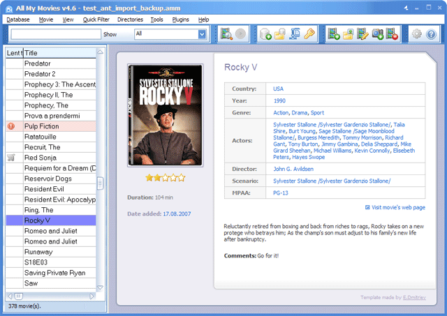 Program určený pro správu domácího archívu filmů na DVD nebo CD discích, VHS páskách apod. Podporuje import údajů z internetových databází filmů IMDb.com, videoguide.ru, RMDb.ru, film.ru, OFDb.de, cinebel.be a dalších. Podporuje vkládání titulů s použitím UPC/EAN čárových kódů, import obalových snímků z Amazon.com a DVDEmpire.com, ukládání informací na mobilní zařízení (PDA, smartphone), přehrávání filmů, import dat v různých formátech (CSV, MS Excel, AMC), a další.