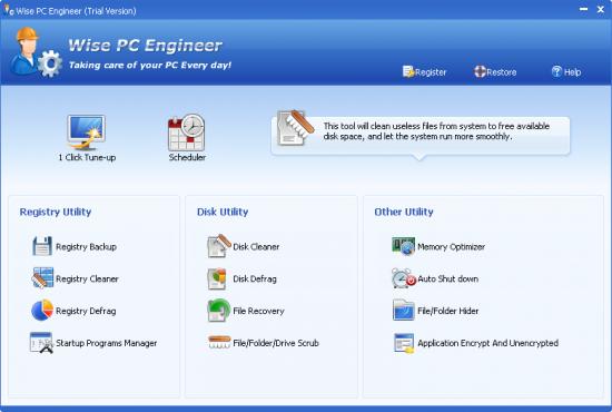 Wise PC Engineer je svazek nejdůležitějších systémových nástrojů pro plnění různých úkolů na PC. Pomůže vyčistit registry systému Windows, volné místo na disku, defragmentaci registru a disku, vymazání soukromých dat a obnovu ztracených souborů, ale také může skrytý důležitý soubor nebo složku.