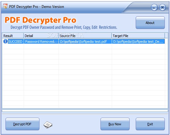PDF Decrypter Pro môže byť použitý na dešifrovanie chránených súborov PDF, ktoré majú "majiteľ" heslo, bráni editácii (zmeny) súborov, tlač, výber textu a grafiky (a kopírovanie do schránky), alebo pridaním / zmenou anotácií a polí formulára.