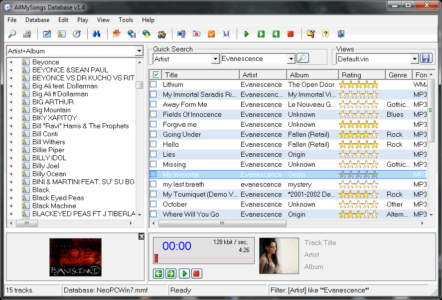 AllMySongs Databáze je hudební knihovna pro správu a katalogizaci hudebních souborů a AudioCD. Podporuje formáty MP3, WMA, OGG, WAV atd. Můžete snadno najít nějakou píseň z hudební sbírky podle názvu, alba, interpreta, žánru apod. nebo jakékoliv složité podmínky. Také si můžete stáhnout obaly, fotky umělců ad.