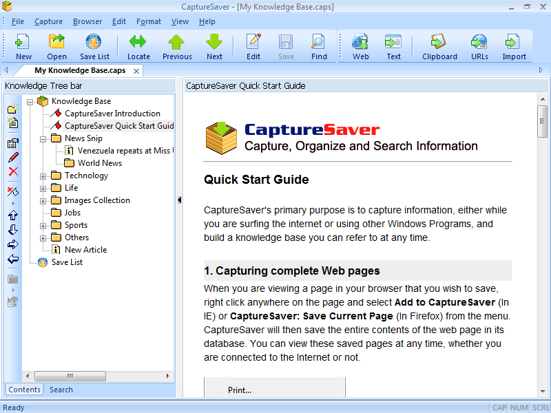 Ukládání a vyhledávání informací okamžitě! CaptureSaver je profesionální internetový výzkumný nástroj, který vám umožní zachytit a trvale uložit informace do off-line příruční knihovny zatímco vy surfujete na internetu. Už nikdy neztratíte důležité informace a nebudete muset opětovně hledat webové stránky.