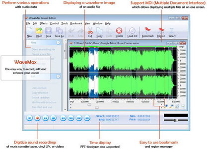 WaveMax Sound Editor je ideálním řešením pro audio editaci a mastering. Program obsahuje vše, co potřebujete k vytvoření skvělých zvukových záznamů a audio CD, včetně profesionálních nástrojů pro záznam, analýzu a střih.