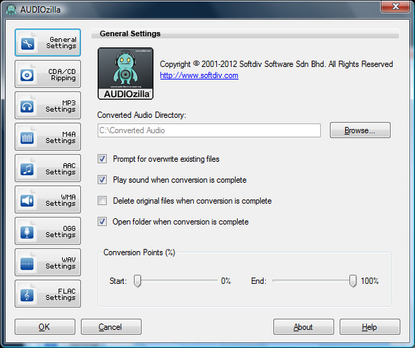 Audiozilla je aplikace pro hromadnou vzájemnou konverzi multimediálních audio souborů typu MP3, M4A, AAC, OGG, WMA, FLAC, AU, WAV, AIFF, MP2, AC3, AU, APE, MPC, MOD, VOC, CAF, RAW, PCM, GSM, VOX a WV. Program rovněž umožňuje konverzi audio CD do hudebních souborů a samozřejmostí je možnost nastavení kvality (bitrate) výstupních souborů.