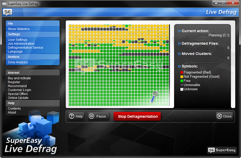 SuperEasy Live Defrag je profesionální nástroj pro analýzu a důkladnou defragmentaci dat ne pevném disku.