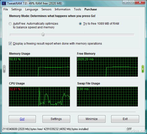 TweakRAM je praktický nástroj pro optimalizaci paměti, který pomůže zajistit rychlejší a efektivní chod vašeho počítače. Zvýší efektivitu činnosti CPU a vyrovnávací paměti základní desky, zvýší velikost paměti dostupné aplikacím a operačnímu systému. Defragmentuje paměť, obnoví paměť po únicích způsobených "nevychovanými" aplikacemi, dočasně uvolní a uloží z paměti na disk nepoužívané knihovny, apod.