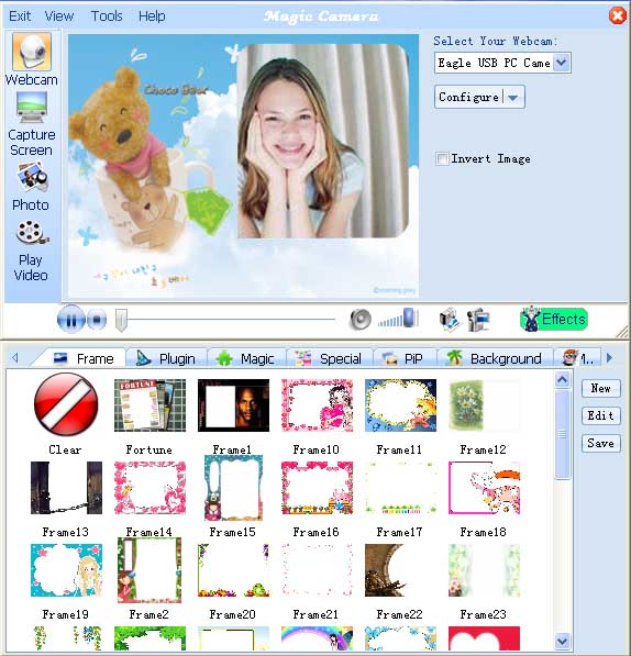 Magic Camera je software pro aplikaci zábavných efektů či rámečků při videohovorech pomocí oblíbených komunikačních programů Skype, ICQ, AIM, MSN Messenger, Yahoo Messenger, Camfrog Video Chat, PalTalk, ANY webcam, BlogTv, Justin.tv, Stickam a dalších.